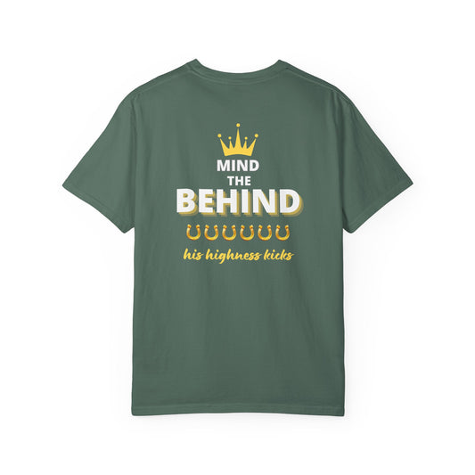 Comfort Colors "Mind the Behind" T-Shirt — "His Highness Kicks" Crown & Horseshoes Tee