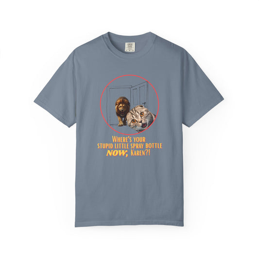 Comfort Colors “Where’s Your Stupid Little Spray Bottle Now, Karen?” Cat and Lion Graphic Tee