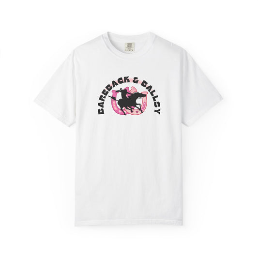 Comfort Colors Bareback & Ballsy Cowboy Graphic T-Shirt — Retro Pink Rodeo Logo Tee