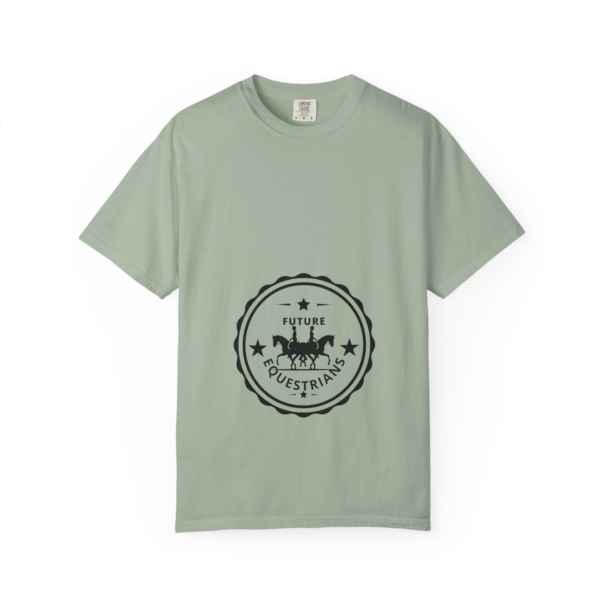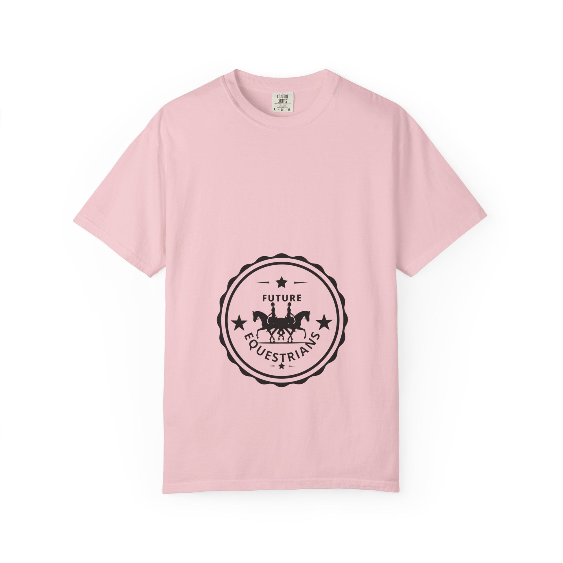 Lightweight yet substantial, this Comfort Colors garment-dyed tee carries a quiet, equestrian-minded charm. The simple stamped logo — two English riders framed in a scalloped badge — foretells the adventures of these young riders to be. It drapes with a relaxed cut and a soft, lived-in hand from post-construction dyeing, so it sits naturally over breeches or jeans and moves with you during lessons, chores, or weekend barn visits. Choose a muted color to deepen that weathered, vintage feel. For the proud mama who can't wait to introduce her youngsters to the joys of equestrian life, this shirt nods to the discipline and day-to-day work behind every ride and blue ribbon without shouting about it.