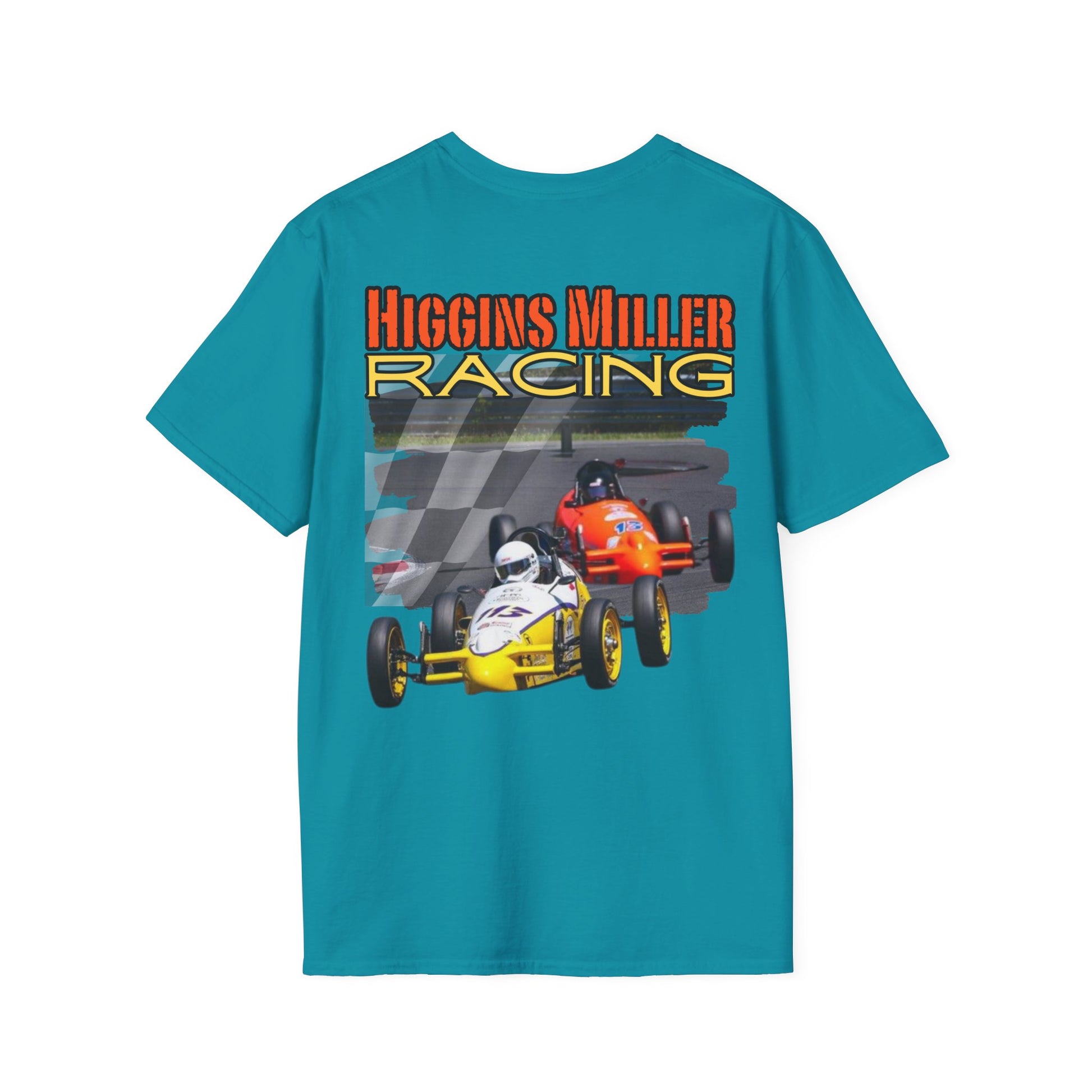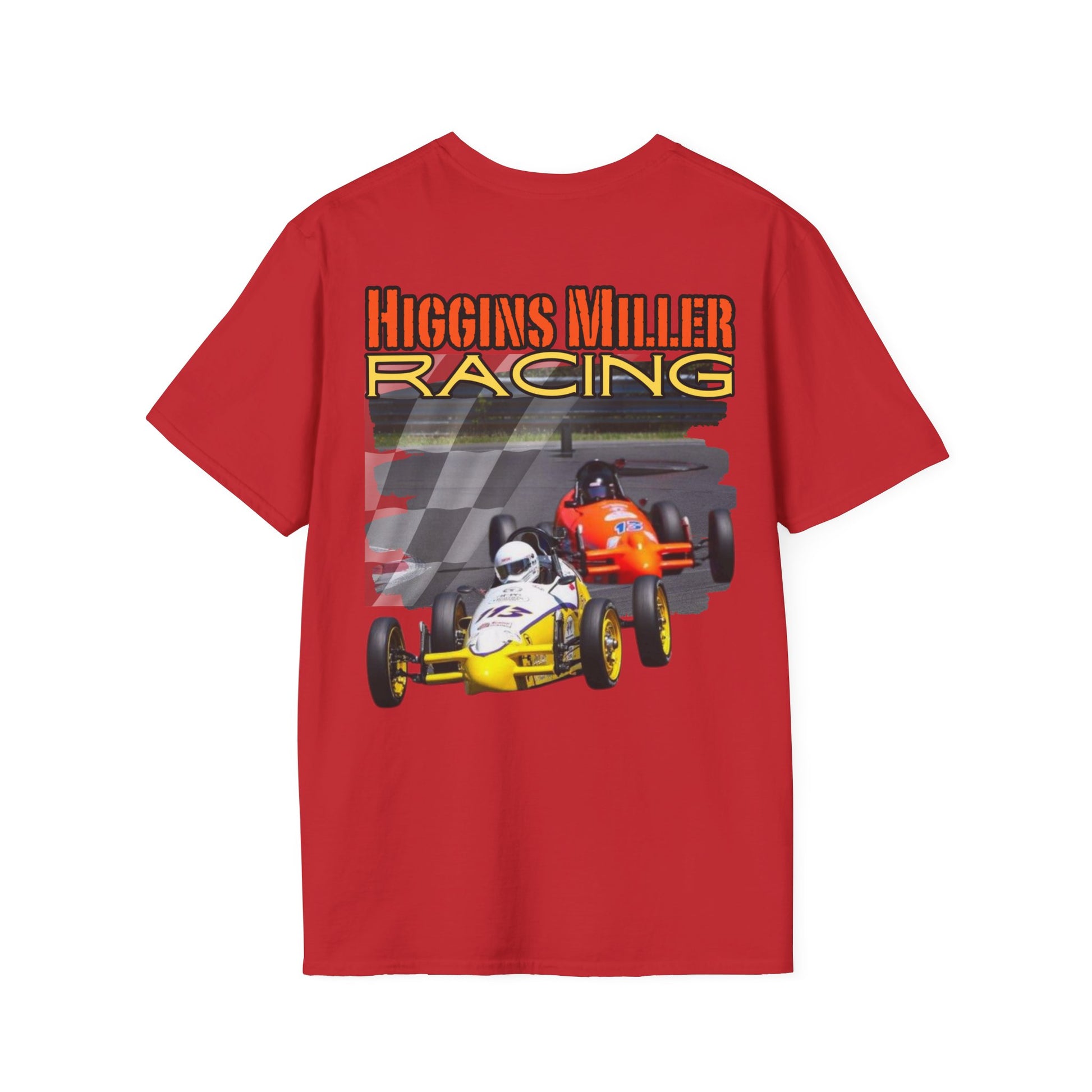 High Res Higgins Miller Soft Style T with flag, Race Day Unisex T-Shirt, Car Racing Shirt, Motorsports Apparel, Gift for Racing Fans, Casual Streetwear.